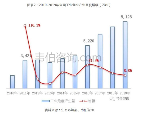 (1)2011年,國(guó)家工業(yè)危廢申報(bào)口徑從一年產(chǎn)生10千克納入統(tǒng)計(jì)改為1千克,統(tǒng)計(jì)數(shù)據(jù)由2010年的1586萬噸激增至3431萬噸,增幅超過100%。