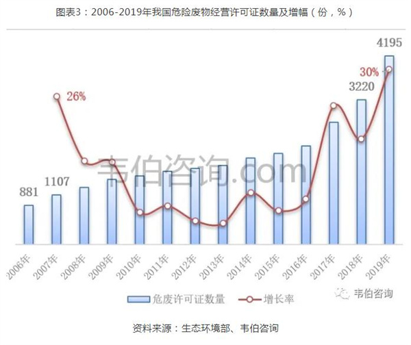 據(jù)根據(jù)我國(guó)生態(tài)環(huán)境部發(fā)布的《2020年全國(guó)大、中城市固體廢物污染環(huán)境防治年報(bào)》:2006年,全國(guó)危險(xiǎn)廢物(含醫(yī)療廢物)許可證數(shù)量?jī)H有881份,此后數(shù)年不斷增長(zhǎng),近三年增長(zhǎng)最快,截止2019年底達(dá)到4195份,同比增長(zhǎng)30%,相比2006年增長(zhǎng)了376%。