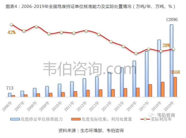 隨著經(jīng)營(yíng)許可證數(shù)量的增長(zhǎng),全國(guó)危險(xiǎn)廢物持證單位核準(zhǔn)能力和實(shí)際收集和利用處置量快速提升。截至2019年底,全國(guó)危險(xiǎn)廢物(含醫(yī)療廢物)經(jīng)營(yíng)單位核準(zhǔn)收集和利用處置能力合計(jì)12,896萬噸/年(含收集能力1,826萬噸/年),危險(xiǎn)廢物實(shí)際收集和利用處置量達(dá)到3,558萬噸(含單獨(dú)收集81萬噸),相比2006年分別大幅增長(zhǎng)17倍和11倍。但由于大部分企業(yè)處理規(guī)模較小,未形成有效處理產(chǎn)能,因此市場(chǎng)整體產(chǎn)能利用率不高。