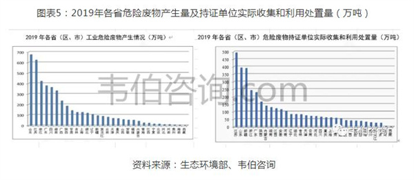 此外,從危廢設(shè)施的空間分布來看,我國(guó)危險(xiǎn)廢物產(chǎn)生量大的區(qū)域主要在東部沿海和西北內(nèi)陸,而危廢處置能力強(qiáng)的地區(qū)位于華東華南。山東、青海、湖南、云南、新疆等地區(qū)危險(xiǎn)廢物產(chǎn)生量遠(yuǎn)大于其處置能力,江蘇、陜西、浙江、江西、廣東等地區(qū)危險(xiǎn)廢物處置能力大于其產(chǎn)生量。由于危險(xiǎn)廢物跨省轉(zhuǎn)移審批手續(xù)復(fù)雜,運(yùn)輸成本較高,使得危險(xiǎn)廢物利用處置區(qū)域供需失衡情況長(zhǎng)期存在。