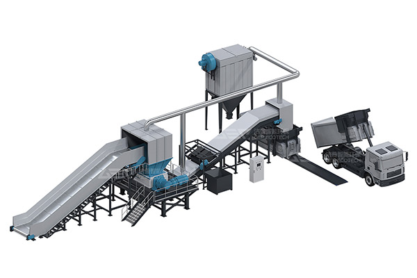 2.鋪料機自動將大件物輸送至傾斜安裝的鏈板式輸送機,鏈板式輸送機通過對物料的提升,將物料至大件垃圾破碎機入口;破碎機通過電機或液壓馬達(dá)帶動破碎刀片組,可以充分對大件垃圾進行剪切及撕扯破碎處理將物料破碎成的細(xì)物料,所有的破碎物料從下端出口卸料至帶式輸送機。