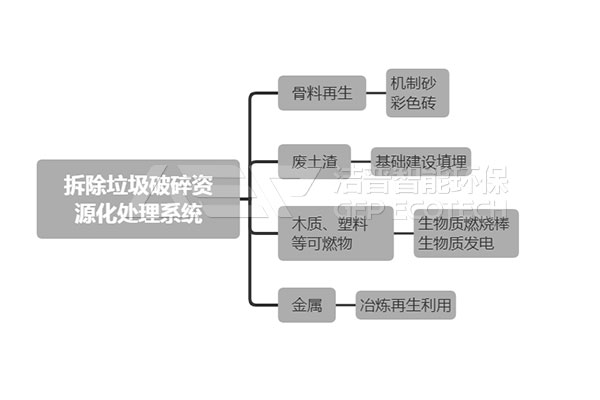 (二)、鄭州潔普智能環(huán)保技術(shù)有限公司針對裝修垃圾-大件垃圾統(tǒng)稱為拆除垃圾或三位一體垃圾。聯(lián)合破碎處理技術(shù)資源化處理系統(tǒng),通過對拆除垃圾進(jìn)行破碎、尺寸篩分、比重篩分、磁選、風(fēng)選、除塵等工藝,分選出金屬、木頭、塑料、玻璃、有色金屬、再生骨料和RDF垃圾衍生燃料,實(shí)現(xiàn)資源回收,再生利用,解決了拆除垃圾污染環(huán)境等問題。