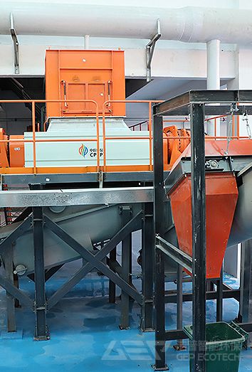 廚余垃圾由行車抓斗送至潔普廚余垃圾處置線,先由廚余垃圾破碎機進(jìn)行粉碎,然后由磁選機分選出垃圾內(nèi)的金屬物品。破碎分選后的廚余垃圾再輸送到細(xì)碎和分選設(shè)備,進(jìn)行有機物與無機物分離。